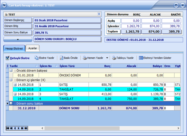 Ekstrenin detaylı veya normal yazdırılması için tek yapmanız gereken "Detaylı ekstre" kutusunu işaretlemek veya işareti kaldırmaktır.