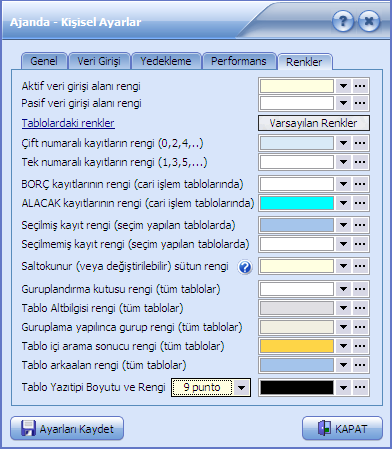 Bu ekrandan Ajanda tablolarındaki renkleri ve yazıtipi boyutunu istediğiniz gibi özelleştirebilirsiniz. Yaptığınız özelleştirmeler tüm Ajanda ekranlarındaki tablolar için geçerli olacaktir.