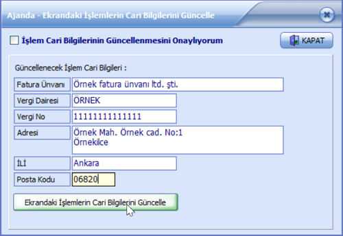 Ekrana güncel bilgiler cari kartından yüklenir. İstenirse bilgilerde güncelleme işlemi öncesinde değişiklik yapılabilir. Bilgilerin kayıtlı işlemlere aktarılması için onaylayıp ilgili düğmeye tıklanması yeterlidir. Ekranda süzgeç uygulanıyorsa, değişiklik sadece süzgeci karşılayan kayıtlar için yapılır.