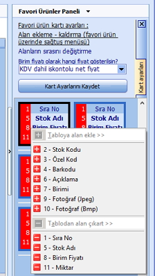 Favori Ürün Kartı Ayarları : Bir favori ürün kartında varsayılan bilgiler olarak Sıra No, Ürün Adı, Birim Fiyatı ve ürün satışa eklendiği zaman miktar bilgisi gösterilir. Favori ürün kartı ayarları seçeneğini kullanarak, gösterilecek bilgilere ilaveler yapabilir ve gösterilen bilgilerin sırasını değiştirebilirsiniz. Menüden "Favori Ürün Kaytı Ayarları" seçildiğinde ayarlama moduna geçilir (aşağıdaki resimde gösteriliyor, örnektir):
